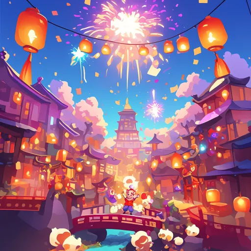 Midjourney Bot 更新时间:2025-12-28 00:00新年春节背景图,欢快卡通,烟花炮竹 --ar 1:1 --stylize 100 --niji 6