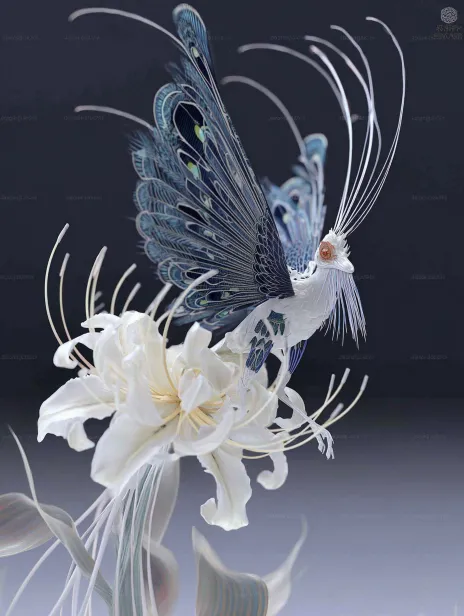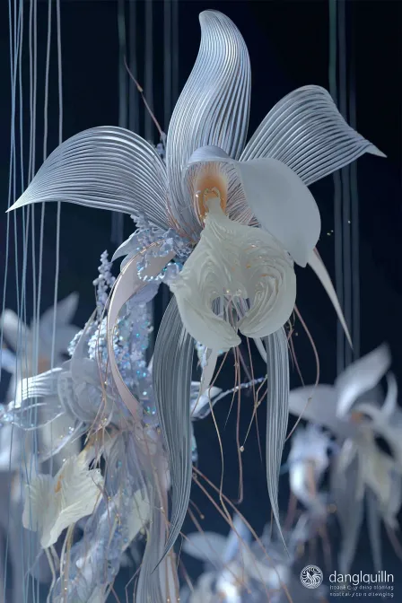 Midjourney Bot 更新时间:2025-12-26 00:13参数化建模的样式,样式具有强规律性和秩序感,样式是批量的衍生且保持一致性,十分规整统一,复杂但具有可控性这件作品是一个异想天开、超现实生物参数化花朵建模,带有光影效果。照未来交互臂设上的仿生兰花,结合孔雀元素。花瓣纹理如孔雀羽毛,通过参数化建模呈现高度规律的重复与渐变,纹理密度、走向由参数精准控制。色彩为孔雀蓝绿经典配色,过渡自然且具秩序感,受参数严格调节。花蕊形似孔雀头,大小、形态依参数变化。整体风格简约,突出参数化建模的秩序美感与未来感,背景简洁 超精细,高分辨率,超现实主义,复杂细节,Blender软件,超高清,最佳质量, --ar 3:4 --v 7 --stylize 100 --sref https://images.gogpt.vip/aigf/m_origin/20251225/1981913/jkistzhjfmm4vjrc.jpg