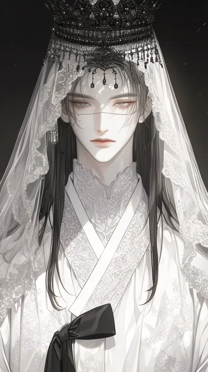Midjourney Bot 更新时间:2025-12-26 00:09视觉系帅哥,黑白线画,日韩漫画,暖色调,清晰8K。黑色直发,黑眼睛,冷漠的眼睛,冷白皮,嘴唇浅色,帅气的男主角身着白色婚纱,头戴精致的面纱,连帽王冠带有串珠流苏,黑色斗篷、黑色串珠九旒冕遮住脸,面衣,站着优雅的姿势,婚纱上装饰着蕾丝和精致的细节, --ar 9:16 --style raw --stylize 180 --niji 6 --no no