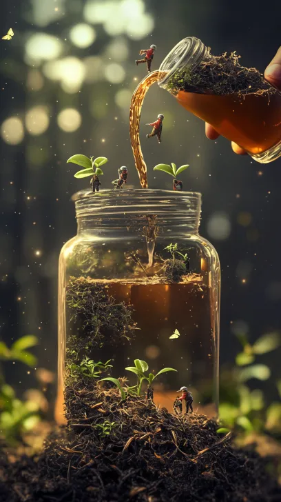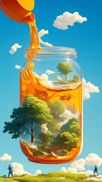 Midjourney Bot 更新时间:2025-12-26 00:09茶饮料广告海报,玻璃杯将液体倒入装满茶叶的空罐子和在现场工作的小人物,现代风格,多彩,超现实,详细的摄影,电影般的灯光 --zoom 2 --ar 9:16 --stylize 100 --niji 6