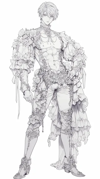 Midjourney Bot 更新时间:2025-12-26 00:10一个俊美动漫男人,(站着),(尽是奢华和古典的面貌。夸张、浪漫),穿着(混搭有褶皱、花朵、水晶、繁复、蕾丝、贵族、花边、复古、束腰、花组成的衣服)(精细刻画),发光,,(黄金比例身材),宽肩细腰,腹肌可见,冷白皮,清晰8K,黑白线画 --ar 9:16 --style raw --stylize 180 --niji 6 --no no