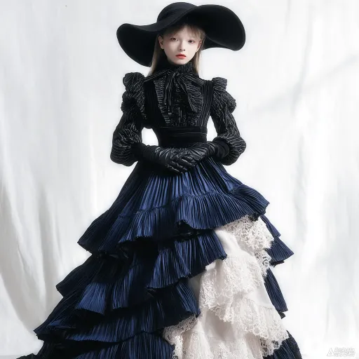 Midjourney Bot 更新时间:2025-12-26 00:10https://images.gogpt.vip/aigf/m_origin/20251225/1820984/wz2g4dz3x4t4938f.png https://images.gogpt.vip/aigf/m_origin/20251225/1820984/rr8rcijyzgijivxj.png 一位身穿复古风格裙子的女孩形象,身着黑色纹的上衣,带有丰富的蕾丝装饰,展现出优雅而华丽的气质。她的裙子是多层波浪状的设计,底层为深蓝色,上面有一层白色的蕾丝花边,增添了层次感。黑色的手套和宽边帽子使整体造型更加精致,展现出独特的时尚风格。服装全身展示,全身视角,把鞋子漏出来,背景为简单的白色,突出人物的服装细节和氛围,给人一种梦幻般的感觉。 --ar 1:1 --v 7 --stylize 100 --iw 1.25