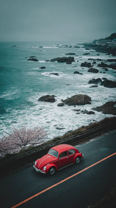 Midjourney Bot 更新时间:2025-12-25 00:07日本镰仓的海边公路,阴天,海面灰蓝色,海浪轻轻拍打着礁石,公路旁的樱花树落英缤纷,一辆复古红色甲壳虫汽车驶过,胶片质感,暗调光影,日系电影美学,冷灰调,氛围感清冷孤寂,构图对称 --ar 9:16 --v 7 --stylize 100