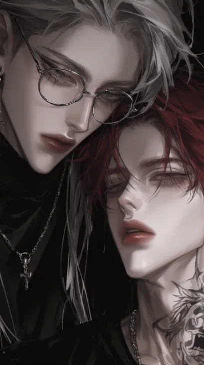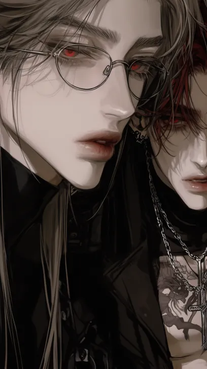 Midjourney Bot 更新时间:2025-12-25 00:09细腻厚涂动漫风格,8K,高清,两位年轻男性,薄唇,高鼻梁,瓜子脸,简约背景,一个黑色黑色瞳孔中长发戴眼镜黑色高领体恤衫的男子,站在红色头发黑色衬衫银色项链胸口纹身的男子身后,附身两人脸贴脸,看着我,半身图,一个斯文一个痞帅 --ar 9:16 --style raw --stylize 443 --niji 6 --profile 138q21m hxc2xte gcga82k --no 耳钉