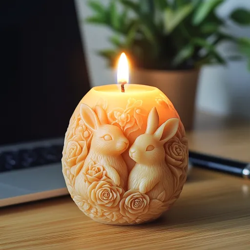 Midjourney Bot 更新时间:2025-12-25 00:11一个鸡蛋形状的蜡烛,鸡蛋上浮雕着两只兔子,兔子双手捧着一束玫瑰花,蜡烛有颜色,蜡烛顶部点燃着微弱的火焰,散发出柔和的光芒。背景中有一本笔记本和一支黑色的圆珠笔,桌面呈现出自然的木纹质感,旁边还有一台笔记本电脑和一盆绿色植物,营造出温馨宁静的氛围 --ar 1:1 --v 6.1