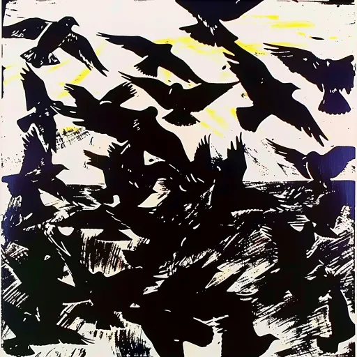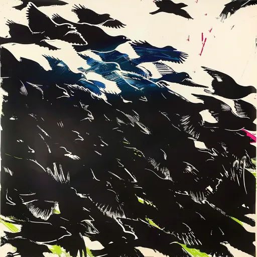 Midjourney Bot 更新时间:2025-12-25 00:07https://images.gogpt.vip/aigf/m_origin/20251224/1094999/ne0sh82vfwbt6hr8.png Expressive monochrome ink painting depicts a large group of dense and numerous flying birds with a consistent orientation. Create using spontaneous, irregular brush and pen lines, with the effects of dry brush flying white and ink splattering. Fill with pure black blocks. The composition is full of energy and freedom, emphasizing the rhythm and texture of brushstrokes. The style is similar to modern calligraphy or abstract ink painting. --ar 1:1 --v 6.0 --style raw --stylize 100 --iw 0.25 --sref https://images.gogpt.vip/aigf/m_origin/20251224/1094999/pxd3256hqs4apv0r.jpeg