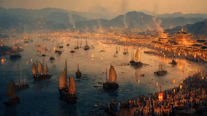 Midjourney Bot 更新时间:2025-12-25 00:08https://images.gogpt.vip/aigf/m_origin/20251224/1998593/12rifw88550n6t38.png Panoramic view: During the Jiajing period of the Ming Dynasty, along the coast of Fuzhou, a group of Fuzhou women wearing three hairpins, narrow sleeved indigo collared short shirts, a reddish brown sleeveless jacket, a gray horse face skirt (with the skirt tucked up at the waist), long pants, and leggings watched as a group of men carrying packages boarded several fishing boats and left. The style of Qingming Riverside Scene is characterized by a vast sense of space, a deep sense of depth, extreme complexity, grand scenes, ultimate details, exquisite textures, aerial photography, panoramic images, artistic beauty, visual tension, and cinematic light and shadow. --ar 16:9 --v 7 --stylize 100 --iw 2