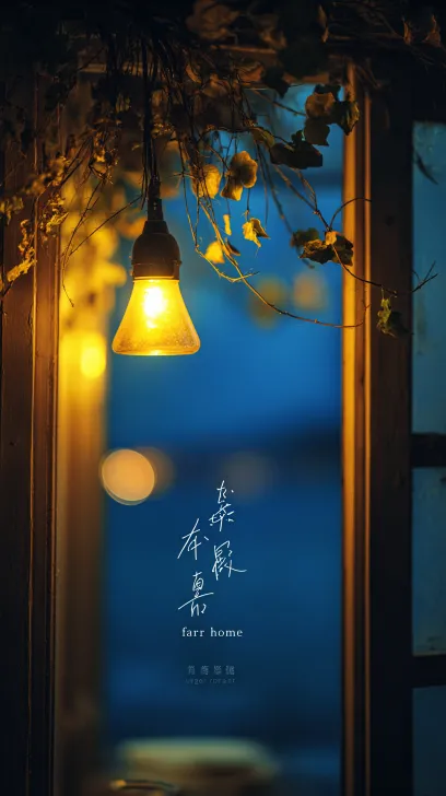 Midjourney Bot 更新时间:2025-12-25 00:08Warm wooden window edge night view, warm yellow pendant light emitting a soft halo, vines hanging from the window frame, blurry deep blue night sky outside the window, film grainy feeling, low saturation, movie grade light and shadow, dark atmosphere, Chinese handwritten text "far away from home" embellished on the left, shallow depth of field, delicate details, 8K high-definition --ar 9:16 --v 7 --stylize 100
