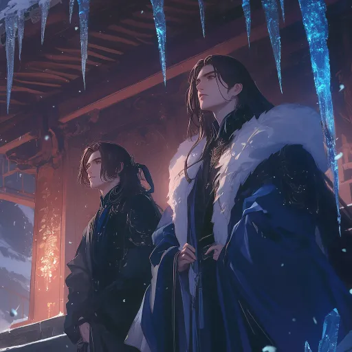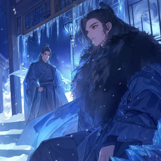 Midjourney Bot 更新时间:2025-12-25 00:09The screen features two handsome young men with cold expressions and distinct facial features. One is wearing a deep blue brocade robe, while the other is draped in a dark fox fur coat, both adorned in a manner befitting ancient nobility. The man in the fox fur coat is taller. They stand on the steps beneath the eaves of a palace, facing outward and away from the palace. The man in the deep blue brocade robe is gazing up at the unevenly hanging, crystal-like icicles from the eaves, while the man in the dark fox fur coat watches him from a few steps behind. The background depicts a snowy night, with scarlet palace lanterns casting a soft glow. The intricate dark folds of their clothing appear lifelike, with rich, saturated colors creating a gentle, soothing atmosphere that carries a slight narrative quality. Exquisite Hanfu, high-end CG, illustration style, nightfall, thick paint, illustration, high-end feel, atmospheric sense, clear and smooth lines, two males, young men, both boys have their long hair tied up, ancient-style hairstyles, black hair, handsome and clean, with refined and beautiful features, ancient-style male anime. Best quality, high resolution, full-body shot. --ar 1:1 --stylize 74 --niji 6