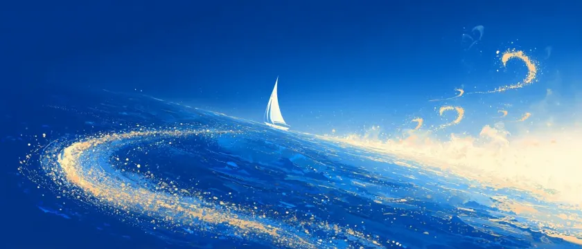 Midjourney Bot 更新时间:2025-12-25 00:09https://images.gogpt.vip/aigf/m_origin/20251225/1993421/u9tequf4ugk2u50p.jpg https://images.gogpt.vip/aigf/m_origin/20251225/1993421/jdg2mr1529ujwtw4.jpg A whimsical illustration depicting an abstract sailboat sailing on the ocean, leaving behind spinning golden dust tracks that transform into exquisite heart-shaped patterns in the azure sky. The background is a deep blue, with soft light shining through the clouds, creating a dreamlike atmosphere. This artwork captures the beauty of nature in a simple and elegant style, symbolizing adventure and love. Digital art. --ar 21:9 --v 7 --stylize 100 --iw 2