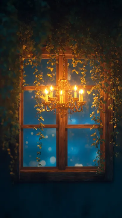 Midjourney Bot 更新时间:2025-12-25 00:10Warm wooden window night scene, warm yellow chandelier emitting a soft glow, vine plants hanging from the window frame, outside the window is a blurry deep blue night sky, film grain texture, low saturation, cinematic lighting and shadow, dark tone atmosphere, shallow depth of field, delicate details, 8K HD --ar 9:16 --v 7 --stylize 100
