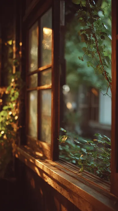 Midjourney Bot 更新时间:2025-12-25 00:10The window sill of the vintage wooden house emits warm light from the interior, with green vines entwining around the wooden frame and hazy light and shadow reflections on the glass. The background is a dark outdoor night, with a Japanese healing wind and a soft warm brown color tone that creates a slight defocusing effect, creating a serene atmosphere --ar 9:16 --v 7 --stylize 100