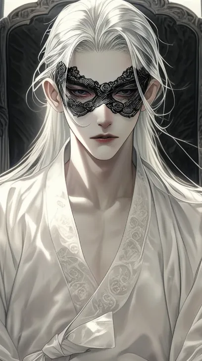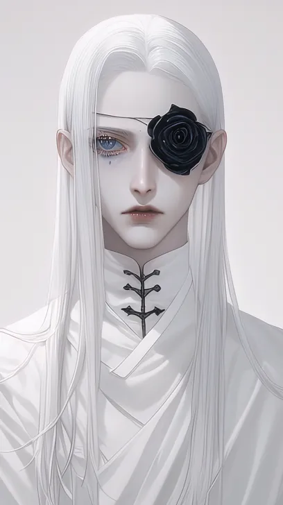 Midjourney Bot 更新时间:2025-12-24 00:18视觉系帅哥,黑白线画,日韩漫画,暖色调,清晰8K。黑 色直发,黑眼睛,冷漠的眼睛,冷白皮,嘴唇浅色一个 俊美男人,白色如丝绸般顺滑的白发,一个黑玫瑰花眼 罩,浓密细长睫毛、根根分明、黑瞳蓝色虹膜、白色眼 线,白色荧光圆领交领长袍,坐在椅子上 --ar 9:16 --style raw --stylize 180 --niji 6 --no no