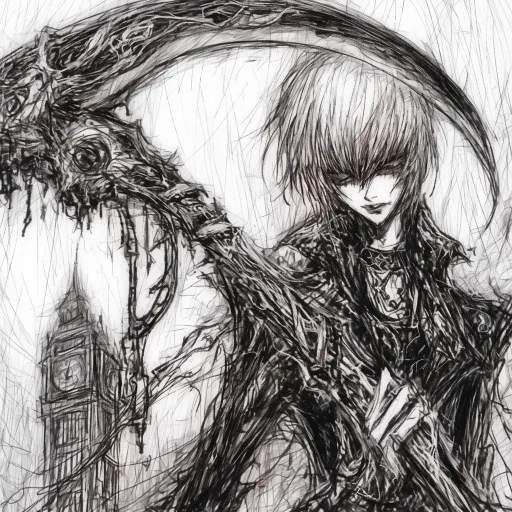 Midjourney Bot 更新时间:2025-12-24 00:13一个皮肤苍白的动画人物,有短短的银色头发,穿着黑色的皮衣,拿着一把巨大而怪异的镰刀,柄像骷髅一样。游戏背景设置在黑暗多雨的城市环境中,背景中有一座突出的钟楼。使用黑白对比强烈的单色配色方案 --ar 1:1 --style raw --stylize 888 --niji 6 --profile 7lzka4w --no blood,weapons,religious symbols,bones,skulls
