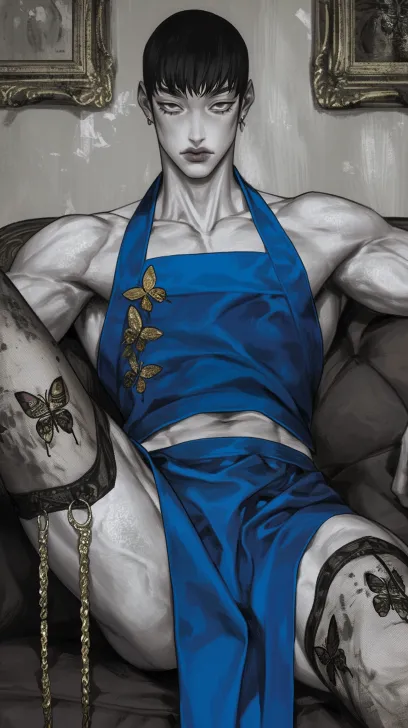 Midjourney Bot 更新时间:2025-12-24 00:14视觉系帅哥,黑白线画,日韩漫画,暖色调,清晰8K。黑色直发,黑眼睛,冷漠的眼睛,冷白皮,嘴唇浅色,腹肌可见,一名穿着蓝色围裙的男子,蝴蝶腿链,长筒袜,坐在沙发上 --ar 9:16 --style raw --stylize 180 --niji 6 --no no