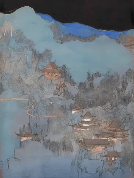 Midjourney Bot 更新时间:2025-12-24 00:15https://images.gogpt.vip/aigf/m_origin/20251223/1999046/5mlqv7ra6rft5c3y.jpg 现代新中式工笔重彩山水画,竖幅卷轴构图,碎裂的岩石肌理铺满整幅画面,淡青蓝色渐变晕染山石,细墨线勾勒岩石纹理与枯树,中景的岩石缝隙间掩映着小型中式村落,低饱和度的蓝色调,做旧的宣纸纹理,纯粹的国画笔触,无照片写实感,构图饱满密实,顶部有深黑色边框搭配浅棕色地块 --ar 3:4 --stylize 100 --niji 6 --sref https://images.gogpt.vip/aigf/m_origin/20251223/1999046/5mlqv7ra6rft5c3y.jpg --cref https://images.gogpt.vip/aigf/m_origin/20251223/1999046/5mlqv7ra6rft5c3y.jpg --cw 100 --sw 405 --sv 3