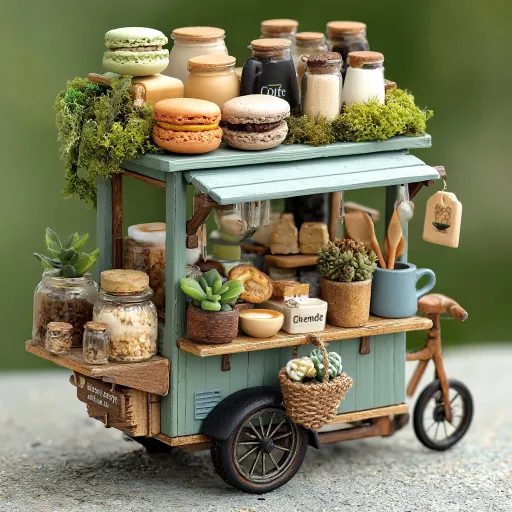 Midjourney Bot 更新时间:2025-12-24 00:15超小众的的迷你餐车,要更精致的物品摆件,注重细节以及真实感,有创意,但不凌乱,注意物品大小比例,物品合理性 --ar 1:1 --v 7 --style raw --stylize 700