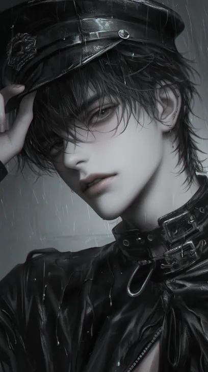 Midjourney Bot 更新时间:2025-12-23 00:10人物为黑发造型,发丝被雨水打湿后凌乱地贴在额前与脸颊,几缕碎发遮挡眉眼,增添了慵懒又疏离的气质;他头戴黑色皮质制服帽,左手轻扶帽檐的动作,让姿态多了几分随性的冷峻。面部线条锋利,肤色苍白,唇色偏淡且带着水润的质感,眼神半阖,目光低垂,透出沉郁又淡漠的情绪,耳骨处的细小耳钉为冷硬的轮廓点缀了精致感。 身着的黑色亮面材质外套(似皮质或防水面料)布满雨水珠,衣料的褶皱与金属纽扣、皮质肩带的细节刻画逼真,水珠的反光让面料的质感更具层次,深色服饰几乎与雨夜的暗调相融,仅靠光影勾勒出轮廓。背景是朦胧的雨夜街巷,能隐约看到中式建筑的飞檐与暖黄色的灯火,雨丝斜落的动态感与模糊的背景结合,营造出潮湿、寂寥的都市雨夜氛围,冷调的雨景与零星暖光形成冷暖对比,进一步强化了画面的氛围感。 --ar 9:16 --niji 6 --sref https://images.gogpt.vip/aigf/m_origin/20251117/1941884/88ygpiwptuykjnce.jpg --sw 68