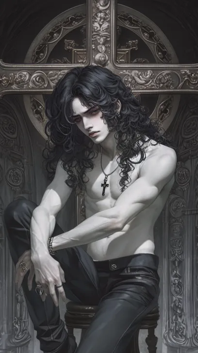Midjourney Bot 更新时间:2025-12-23 00:12由贵香织里和柴本风格的结合,暗黑颓废系,视觉系帅哥,黑白线画,日韩漫画,暖色调,清晰8K。黑色长卷发,黑眼睛,冷漠的眼睛,冷白皮,嘴唇浅色,腹肌可见,高挑纤瘦,美男歪着头抱膝坐在高椅上,怀孕,冷漠地看着镜头,艳丽的面容,卷发 、长长的羊毛卷,长发搭在肩头,银饰,暗部细节,超大十字架背景,暗黑色系哥特场景,日系摇滚和欧系颓废唯美 --ar 9:16 --style raw --stylize 180 --niji 6 --no no