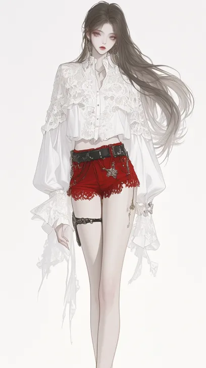 Midjourney Bot 更新时间:2025-12-23 00:15https://images.gogpt.vip/aigf/m_origin/20251223/1543705/vpm9ts6bxlxlusv3.jpg 画面展示了一位身穿时尚服装的女性角色站在纯白色背景前。她的上半身穿着一件宽松的白色衬衫,衬衫的设计带有蕾丝细节,显得既优雅又帅气。下半身是红色短裤,搭配黑色腰带,短裤的边缘也有蕾丝装饰,增添了独特的风格。脚踩一双白色高跟鞋,角色的长发飘逸,增添了动感。整体造型时尚前卫,展现出一种自信与魅力的气质。背景为简洁的白色,突显了角色的细节与服装设计。 --ar 9:16 --style raw --iw 0.25 --niji 6 --profile piyyh7z wdank8v gcga82k --no 齐刘海,刘海,