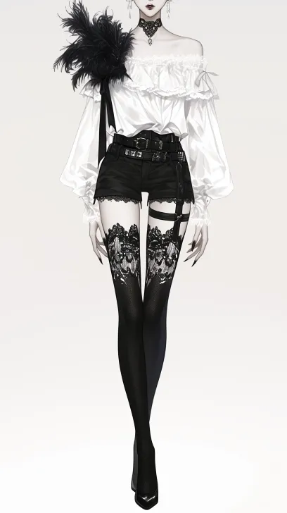 Midjourney Bot 更新时间:2025-12-23 00:18https://images.gogpt.vip/aigf/m_origin/20251223/1543705/j3p2fvu6tncnr9pc.jpg 画面展示了一位时尚女性,身穿独特的服装。她的上身是一件白色的露肩衬衫,衬衫的设计带有黑色羽毛装饰,增添了个性与风格。下身穿着黑色短裤,搭配黑色腰带,突出身形。腿部则穿着精美的黑色蕾丝袜,蕾丝图案华丽而细致,展现出优雅与美丽。整体造型融合了现代与个性的元素,显得既时尚又引人注目。背景为简单的白色,突显了角色的服装设计和细节。 --ar 9:16 --style raw --iw 0.25 --niji 6 --profile piyyh7z wdank8v gcga82k --no 齐刘海,刘海,