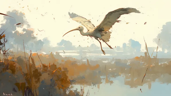 Midjourney Bot 更新时间:2025-12-23 00:18https://images.gogpt.vip/aigf/m_origin/20251130/1965222/opry9bdk7mbaceu0.jpg https://images.gogpt.vip/aigf/m_origin/20251222/1965222/z80qac4yvfd1zpeq.jpg 动态构图。一只灰白色调的彩鹮(眼中带光)正从画面右侧的混沌灰雾中飞出,向左前方一片正逐渐晕染开来的淡彩湿地飞去。它身后拖出淡淡的、即将消散的彩色墨迹。前景是模糊的水墨,远景是隐约的、湿润的芦苇与水光。整体是《Naiad》风格的游戏封面艺术:水彩晕染,动态模糊,柔和发光,充满动感与叙事性,象征着旅程的开始。 --ar 16:9 --stylize 100 --iw 0.25 --niji 6