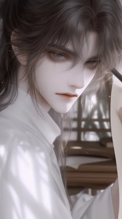 Midjourney Bot 更新时间:2025-12-23 00:19近景特写(微俯视角) · 人物性别:成年男性。 · 视角与取景:微俯视角。画面清晰框取人物头部、肩部及提笔写字的手部。 · 面部聚焦: · 表情:眼帘低垂,视线专注落于纸面,神情宁静。 · 瞳色:深黑。 · 显著特征:墨色长发半束半披,面容清俊,侧脸线条优雅。 · 穿着与配饰:身着素雅的月白色宽袖长袍,衣袖挽起,露出一截手腕。 · 周围物品与背景:右手提笔,悬于铺开的宣纸之上。背景是竹制窗棂,阳光从侧面透过窗格洒下,在纸面、笔杆和人物肩头形成明亮的光斑与柔和的光晕。可见部分竹制书案与堆放的书卷。 · 整体意境:人物于竹舍内提笔书写,墨发白衣,侧影沉静。倾斜而入的阳光为画面增添了温暖的生命力与层次感,整体氛围宁静、文雅、充满书卷气,定格了文人雅士专注治学的闲适瞬间。 --ar 9:16 --stylize 100 --niji 6 --sref https://images.gogpt.vip/aigf/m_origin/20251206/1973990/we4q9p142al2i8zf.jpg https://images.gogpt.vip/aigf/m_origin/20251206/1973990/vfifw6az1w9dekze.jpg https://images.gogpt.vip/aigf/m_origin/20251206/1973990/zpcjrnnwi0ektt8m.jpg https://images.gogpt.vip/aigf/m_origin/20251206/1973990/852e5r2vuojkpo9c.jpg --sw 1000 --no 纹身、幼态、孩子、儿童、少年
