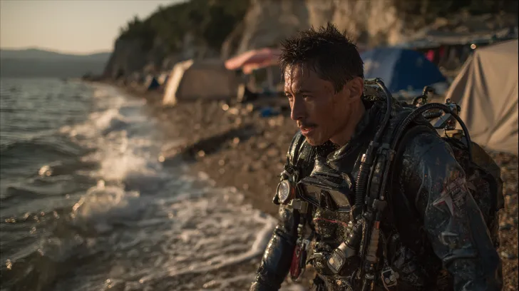 Midjourney Bot 更新时间:2025-12-23 00:21海边营地全景,阳光沙滩,蓝色海浪,一名帅气的中国青年男潜水员(深蓝潜水服和装备)从海面走向岸上,左手拿着黑色潜水镜,右手抹掉脸上海水,他背景是背景帐篷 + 遮阳伞 + 装备,暖色调自然光,8K 超写实,沙滩纹理细腻,海浪泡沫清晰,ARRlAlexa 65+ Cooke vintage cinemaenses,胶片质感:35mm胶片颗粒,KodakVision3500T美学,视觉风格:纪录片写实质感 自然光线 --ar 16:9 --v 7 --stylize 236 --no Characters,text,symbols.