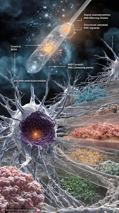 Midjourney Bot 更新时间:2025-12-23 00:21创建一幅科学插图,展示胶质瘤的层级化生态系统。核心坏死区呈现为暗红色酸性沼泽,漂浮凋亡小体。周围是高度异质性的肿瘤细胞森林,颜色从紫色(干细胞)到粉色(分化细胞)渐变。最外层为侵袭前沿,肿瘤细胞沿白质纤维束、血管旁间隙、脑实质三维扩散。使用生态学术语标注:“核心生态崩溃区”、“高竞争性生态群落”、“生态入侵前沿”。绘制神经元突触与胶质瘤细胞形成功能连接的微观场景。显示神经元释放谷氨酸(蓝色分子流)激活肿瘤细胞表面NMDA受体。同时肿瘤细胞释放BDNF(绿色分子云)吸引神经突触包裹。背景中加入“活动依赖性生长”图示:大脑功能区神经元活动增强时,相邻肿瘤区域增殖信号增加。添加标注:“神经回路劫持与活动依赖性促瘤”。可视化胶质瘤的瓦博格效应代谢网络。血管释放葡萄糖(黄色分子流)被肿瘤细胞大量摄取,产生乳酸(绿色分子流)。乳酸被肿瘤相关巨噬细胞和反应性星形胶质细胞摄取进行氧化磷酸化。同时展示谷氨酰胺代谢通路。用热图显示pH梯度(红色酸性区域)和氧梯度(蓝色缺氧区域)。标注:“代谢共生与生态位适应”。 --ar 9:16 --v 7 --stylize 100