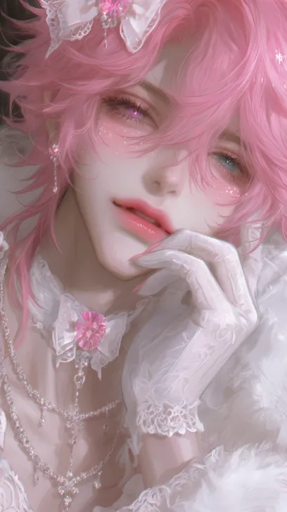 Midjourney Bot 更新时间:2025-12-23 00:24数字绘画,笔触插画,广角,全身图,细闪效果,波光粼粼,珠光效果,矿物粒子闪烁效果渲染,全图突出闪耀感男,男性,猫耳,粉色闪烁微卷发,发丝间带led般闪耀细链,细闪闪片效果,复杂碎钻闪耀发饰,慵懒感,妖冶,闪烁细闪闪瞳,眼尾拉长上挑,魅惑表情,眼妆,镜面红色渐变唇釉,单人男性,铃铛项圈,粉白蕾丝蝴蝶结,高精度面部刻画,有猫咪的粉白色毛绒绒猫尾巴,正脸微抬头,病娇笑,虎牙,坐在白色毛绒绒垫子上,单手放嘴边,白蕾丝手套,闪钻装点,细腻厚涂,高品质 --ar 9:16 --style raw --stylize 369 --niji 6 --profile xe5id5h
