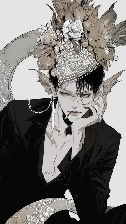 Midjourney Bot 更新时间:2025-12-23 00:25视觉系帅哥,黑白线画,日韩漫画,暖色调。清晰8K。黑色直发,黑眼睛,冷漠的眼睛,冷白皮,嘴唇浅色,帅气的男人,珍珠鲜花刺绣帽子京剧发冠,mermaid拟人,耳鳍,鳞片,大大的鱼尾,穿黑色西装,嘴里叼着一根烟,坐在沙发上 --ar 9:16 --style raw --stylize 180 --niji 6 --no no