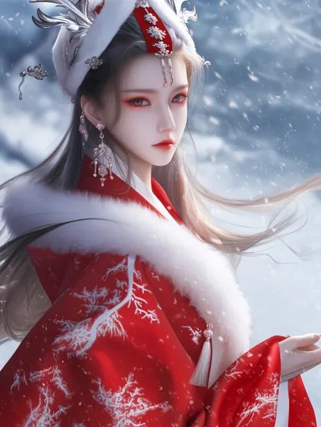 Midjourney Bot 更新时间:2025-12-23 00:28一位身穿华丽红色衣服的女性,衣服上装饰有白色毛皮,展现出优雅的风格。绝美面貌,淡妆,卡姿兰大眼睛,美瞳,她的长发随风飘扬,搭配着精美的头饰和耳环,增添了神秘感。背景是雪白的雪景,营造出寒冷而梦幻的氛围。整体画面采用细腻的光影效果,增强了人物的立体感与美感,表现出一种古典而高贵的气质。 超高清,中式服装, --ar 3:4 --style raw --stylize 96 --niji 6 --no 水印,字母,图标,畸形手指,模糊的画面,畸形人物,