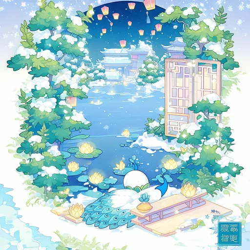 Midjourney Bot 更新时间:2025-12-22 00:17https://images.gogpt.vip/aigf/m_origin/20251222/617471/m2ay8dntt0m08x2l.jpg https://images.gogpt.vip/aigf/m_origin/20251216/617471/2k9yhogk7f3qs8g9.jpg https://images.gogpt.vip/aigf/m_origin/20251222/617471/l1pketfnlrjwikzx.jpg https://images.gogpt.vip/aigf/m_origin/20251216/617471/5n7t143a1et5kwwq.png 平视,平视,没有人,松树枝上有积雪,湖面上也有几朵莲花灯,背景是黑夜,雪夜的湖边,远处空中漂浮着许多的孔明灯,远处还有一些古代建筑的水墨画剪影没有细节,优雅,古朴,整体风格唯美梦幻,充满了东方古典韵味,白色孔雀,水彩画风格,超精细细节,星星点点,浪漫可爱,水彩,pixiv, Q版,二头身,圆形古风窗框五彩缤纷的颜色,多巴胺, HDR, HD,UHD, 64K,色彩调和,可爱场景,SD场景,winter color palette, Icy blue, cloud white, gray peach --ar 1:1 --stylize 100 --niji 6 --sref https://images.gogpt.vip/aigf/m_origin/20251216/617471/5n7t143a1et5kwwq.png https://images.gogpt.vip/aigf/m_origin/20251216/617471/2k9yhogk7f3qs8g9.jpg https://images.gogpt.vip/aigf/m_origin/20251222/617471/l1pketfnlrjwikzx.jpg https://images.gogpt.vip/aigf/m_origin/20251222/617471/m2ay8dntt0m08x2l.jpg --no 平视以外的视角,人,人类,
