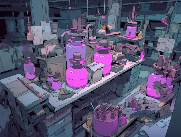 Midjourney Bot 更新时间:2025-12-22 00:17实验室,紫黑色背景,美式漫画风格,配色大胆,粗黑色轮廓线, --ar 4:3 --style expressive --stylize 250 --niji 5
