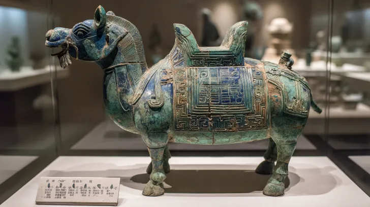Midjourney Bot 更新时间:2025-12-23 00:02纯矢量风格的唐三彩陶瓷信息可视化海报 中央有编号釉层的三彩骆驼载乐俑 左侧有骆驼图标的丝绸之路贸易, 底部显示关键生产时期的时间线 ,右上角的颜料化学图 所有这些都是单色(氧化绿/琥珀色/象牙 色),有1个黑色笔划,严格的12列网格,博物馆标签排版 --ar 16:9 --v 7 --stylize 62