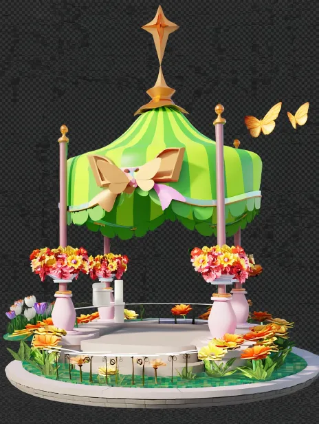Midjourney Bot 更新时间:2025-12-23 00:03https://images.gogpt.vip/aigf/m_origin/20251222/151551/o2fql5ru2nku1b47.png 一个色彩鲜艳的花亭,顶部为绿色的帐篷,配有金色的装饰,中央有一个大蝴蝶结。亭子的四个支柱为粉色,底部有一圈精致的花草装饰。周围布满了盛开的花朵,色彩丰富,营造出温馨和欢快的氛围。亭子坐落在一个简单的台阶上,整体设计具有卡通风格,细节丰富且富有童趣。 --zoom 2 --ar 3:4 --v 7 --c 5 --weird 1 --stylize 300 --iw 0.5 --sref https://images.gogpt.vip/aigf/m_origin/20251222/151551/o2fql5ru2nku1b47.png --oref https://images.gogpt.vip/aigf/m_origin/20251222/151551/o2fql5ru2nku1b47.png --ow 110 --sw 337