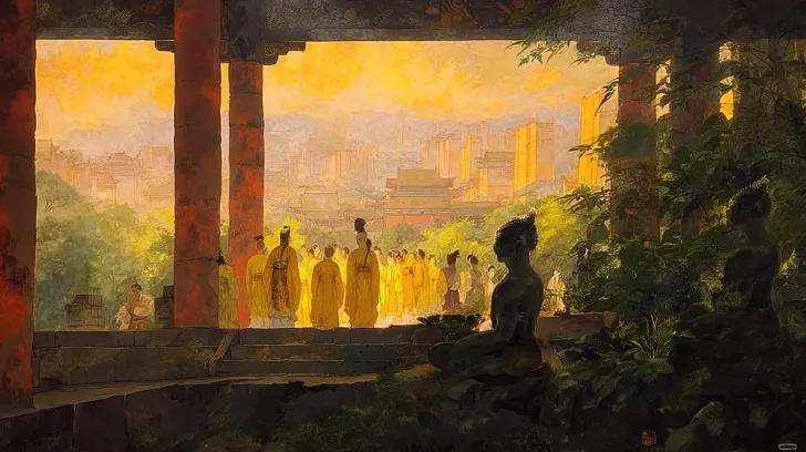 Midjourney Bot 更新时间:2025-12-23 00:05晨曦微光中,辉煌的大殿(如含元殿)巍峨屹立于镜头远景中心,百官身着绯紫朝服,持笏板,如彩云般列队登上漫长威严的台阶,两方台阶中间是舞爪龙雕塑。庙宇金瓦红柱,在朝阳下泛起暖金色光芒,远处长安城轮廓在薄雾镜头下若隐若现。 画风要中国古典美学插画,厚涂风格,唐卡色调,俯视视角,中心构图,晨曦之光,朱红配色,百官列队,层叠庙宇,云气缭绕,庄严恢弘。 高分辨率,16K质量,全息五彩,电影质感,枫叶红,古代中式,詹姆斯琼, --ar 16:9 --v 7 --style raw --stylize 100 --sref https://images.gogpt.vip/aigf/m_origin/20251223/1997486/1ksebcg5hh8zfaid.jpg --oref https://images.gogpt.vip/aigf/m_origin/20251223/1997486/eu252dwa0qjchpw8.jpg --ow 400 --sw 453