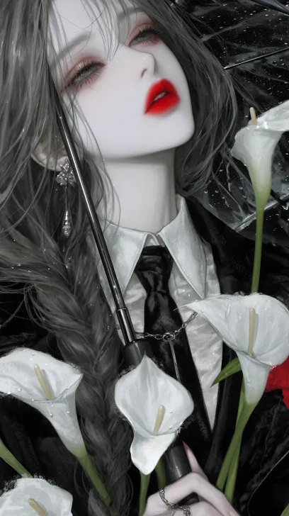 Midjourney Bot 更新时间:2025-12-23 00:08浅金色长直发少女,侧边编发,齐刘海,身穿黑色外套内搭白色衬衫,手持透明雨伞与白色花束,背景是雨中的白色花丛,风格清新文艺 --ar 9:16 --stylize 567 --niji 6 --profile t8cy1vq