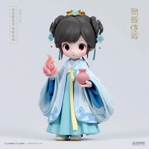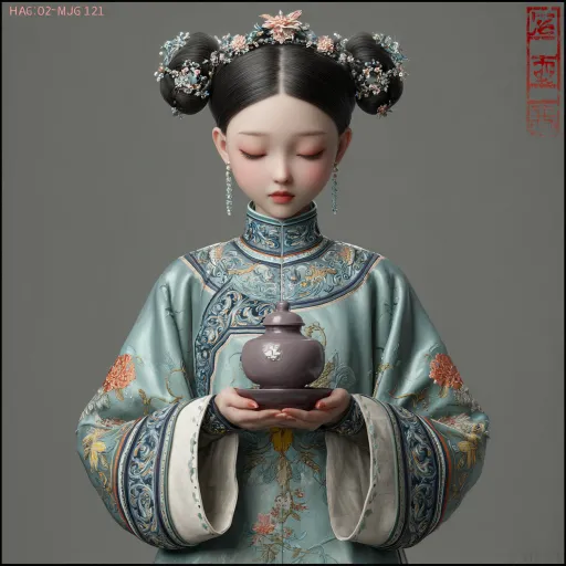 Midjourney Bot 更新时间:2025-12-20 00:07图片风格为 「3D渲染」,一位女孩,面容温柔坚定,穿着光绪年间立领右衽短袄和精致马面裙。短袄衣襟、袖口有精细的“三蓝绣”风格缠枝莲花纹滚边。马面裙的裙门上,绣有对称的萱草图案与柔和的水波纹。梳着双髻,头戴小巧的银点翠花簪和一座微型的乌木牌坊发簪。双手恭敬地捧着一个冒着淡淡热气的紫砂小药盏。整体色调为云峰白短袄、雨过天青色马面裙,滚边为群青色,纹饰点缀浅金色。材质呈现哑光棉麻与带有柔和光泽的缎面质感。高质量Q版IP形象(包含三视图:正面、侧面和后面)完整的展示 C4D软件,3D模型,3D渲染, --ar 1:1 --v 7 --stylize 100 --sref https://images.gogpt.vip/aigf/m_origin/20251219/1992389/yjdxovx5lpk4i5t2.jpg