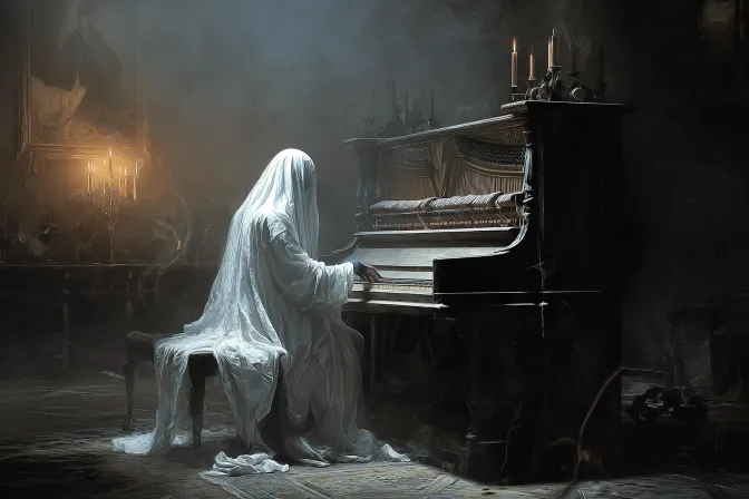 Midjourney Bot 更新时间:2025-12-20 00:01https://images.gogpt.vip/aigf/m_origin/20251219/1926431/azlf2e1ingm6p5i0.jpg 在一个阴暗而神秘的房间里,一个穿着白色布料的幽灵坐在一架古老的钢琴前,专心致志地弹奏着。幽灵的形象轻盈而飘渺,长袍的边缘在地面上轻轻拖曳。房间的背景显得阴森,墙上挂着蜡烛,微弱的烛光映照出阴影,四周弥漫着烟雾,营造出一种神秘而超现实的氛围。整体画面结合了音乐与幽灵主题,充满了戏剧性与情感。 提示词:幽灵,白色布料,古老钢琴,阴暗房间,神秘氛围,音乐与超现实。 高分辨率, 最佳质量, 超高清, 16K质量, 超精细 --ar 3:2 --v 7 --stylize 100 --no 3D