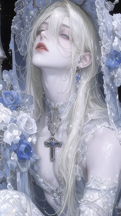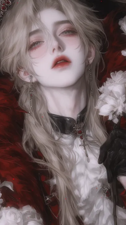 Midjourney Bot 更新时间:2025-12-20 00:04以动漫水彩的视觉效果呈现,全身特写展示一位冷白皮肤、高傲放肆又带些慵懒的西方大少爷。冷艳男子,苍白肌肤,浅金长发,姿态优雅且带有疏离感,白到深红渐变礼服,,丝绸质感带珠光光泽,华丽王冠,手持花束,精致手套,哥特式建筑,散落的红粒子特效,高级奢华的暗黑氛围感,眼神中满是慵懒与偏执。采用极致厚涂和细节刻画,画面有颗粒感与琉璃质感,用流线笔刷绘制,低柔光营造出流体质感与朦胧低饱和度色调。 --ar 9:16 --style raw --stylize 815 --niji 6 --sref https://images.gogpt.vip/aigf/m_origin/20251219/1834018/yfctpv5dudponxz8.jpg --sw 277 --profile v9rrjvt hxzooh8 9qvesrk