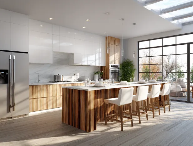 Midjourney Bot 更新时间:2025-12-20 00:04U型布局的豪华轻奢现代厨房,白色slim shaker门款的上柜与木纹slimshaker门款的下柜形成优雅对比。左侧高柜内置冰箱、烤箱和微波炉,右侧中部是sink柜对明亮窗户,接着几个配套柜子延伸至大型玻璃推拉门。中央流线型中岛搭配几张高脚餐椅。整体设计精致温馨,背景营造舒适氛围。摄影风格采用超高清细节、自然光线和柔和阴影,呈现逼真照片级效果。融入虚幻引擎渲染和光线追踪技术,模仿格雷戈里·克鲁德森的光影表现,打造电影级视觉体验。 --ar 4:3 --v 7 --stylize 100