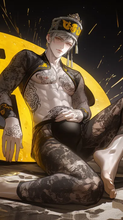Midjourney Bot 更新时间:2025-12-20 00:06一个俊美动漫男人,fit,怀孕,清晰8K,冷白皮,腹肌可见,双腿细长,发光,夜晚,身上胸前和腿上都有纹身,黑蕾丝汉服,刺绣帽子京剧发冠,黄白线画,后仰,呈大字型坐在地上,正面视角, --ar 9:16 --style raw --stylize 180 --niji 6 --no no