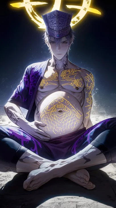Midjourney Bot 更新时间:2025-12-20 00:06一个俊美动漫男人,fit,怀孕,清晰8K,冷白皮,腹肌可见,双腿细长,发光,夜晚,身上胸前和腿上都有纹身,紫色蕾丝汉服,刺绣帽子京剧发冠,黄白线画,后仰,呈大字型坐在地上,正面视角 --ar 9:16 --style raw --stylize 180 --niji 6 --no no