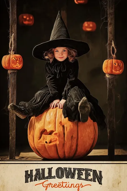 Midjourney Bot 更新时间:2025-12-20 00:09https://images.gogpt.vip/aigf/m_origin/20251219/1926431/c4sbratmvqnj5x0s.jpg 这幅图展示了一位小女孩穿着黑色的巫师服装,坐在一个巨大的南瓜上,南瓜的表情生动而富有趣味。女孩头戴尖顶巫师帽,显得可爱而俏皮。背景中有悬挂的南瓜装饰,增添了节日气氛。画面底部用醒目的字体写着“Halloween Greetings”,整体风格充满了复古的魅力和万圣节的欢庆气息。 提示词:小女孩,巫师服装,南瓜,万圣节,复古风格,欢庆气氛。 高分辨率, 最佳质量, 超高清, 16K质量, 超精细 --ar 2:3 --v 7 --stylize 100 --no 3D
