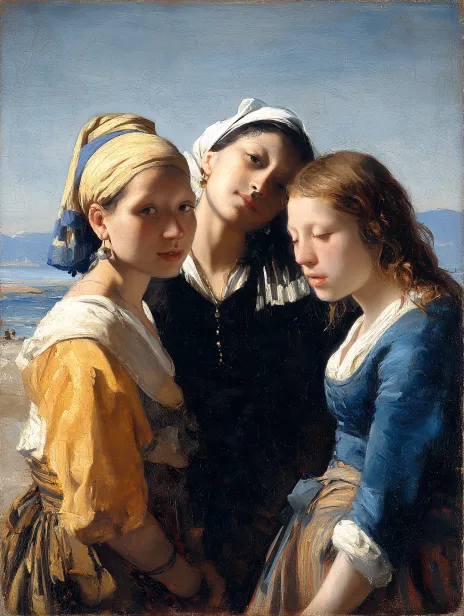 Midjourney Bot 更新时间:2025-12-19 00:15In the picture, there are three women, with a young woman in the middle leaning sideways, with loose hair, and the background being the seaside. The painting adopts a classic oil painting style, emphasizing delicate light and shadow changes and texture expression. --ar 3:4 --v 7 --oref https://images.gogpt.vip/aigf/m_origin/20251218/395313/esks5q7shoq1jtm6.jpg --ow 223