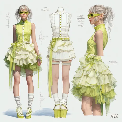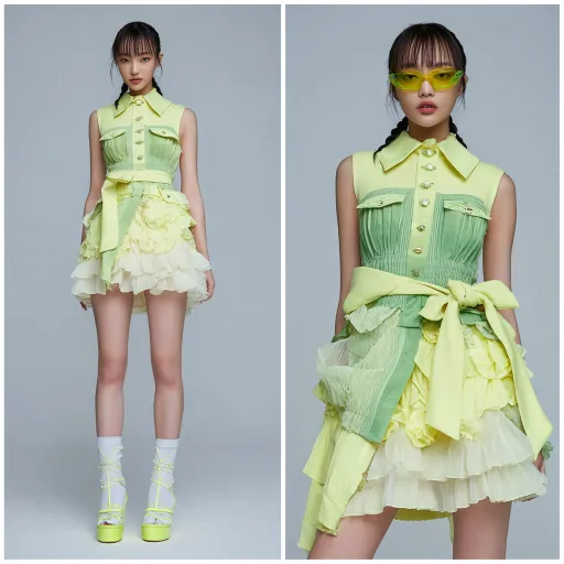 Midjourney Bot 更新时间:2025-12-17 00:15https://images.gogpt.vip/aigf/m_origin/20251216/110557/608o9w3rbk0fn8dw.jpeg https://images.gogpt.vip/aigf/m_origin/20251217/110557/cxsrguwmgrodhzwr.png Help me generate a sleeveless outfit design primarily in light yellow-green, presenting design details from both the front and side perspectives. The top is a stand-collar sleeveless style, complemented by multiple layers of ruffles and vertical pleating, paired with a single row of buttons to enhance structural feel; the bottom is a multi-layer cake skirt, pieced together with green sheer fabrics of differing brightness, and decorated on the side with long flowing ribbon bows to add dynamism. The overall look combines Y2K sweet cool style with girlishness, accessorized with white slouchy socks, fluorescent yellow high-heeled sandals, futuristic sunglasses, and braided hairstyles, creating contrast through delicate ruffles, ribbons, and sturdy metal accessories, resulting in a visual effect that merges retro sweet girl charm with avant-garde street style. The style falls under the category of short, fitted spicy girl outfits, focusing on layered stitching and color clashing design ingenuity, high quality, and high detail. --ar 1:1 --v 7 --stylize 100 --iw 0.3
