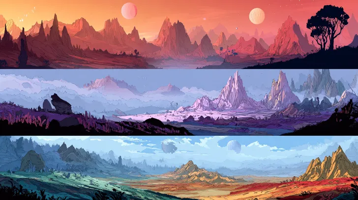 Midjourney Bot 更新时间:2025-12-17 00:13火星、超现实主义、梦核感、生物科幻、电影圣山、平视、全景,一片未被科技完全统治的原始火星土地,充满神性与梦核感,有一些原始感的栖息地,色彩丰富又兼具童趣感。画面层次丰富,山远看只有一两座维度很宽的剪影, --ar 16:9 --v 7 --style raw --stylize 100
