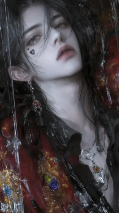 Midjourney Bot 更新时间:2025-12-17 00:15古风男性,半身特写,墨黑长发微乱,面容清冷带艳色,身着绣满金彩暗纹的正红服饰(饰有黑绒边与彩石装饰),衣摆缀流苏挂饰,背景暗调红金质感,光线明暗交织,写实数字绘画风格,高细节,8K画质,气质冷冽又华丽。 --ar 9:16 --style raw --stylize 1000 --niji 6 --profile hjj4rxi bt5yavm pb4clzi --no watermark,text,european,old,