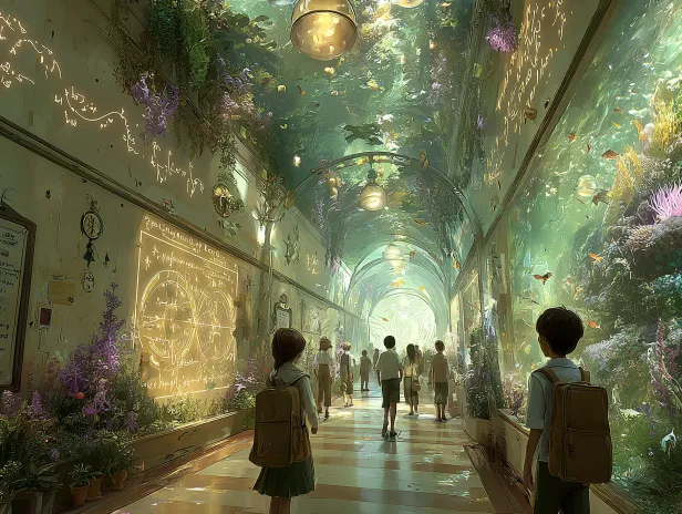 Midjourney Bot 更新时间:2025-12-17 00:13School Corridor- A Passage Through Time and Space Instruction: Subject: Students are shuttling through the corridor, showcasing their curiosity and spirit of exploration towards the unknown. Details: The corridor has transformed into a passage connecting different times and spaces, with walls covered in glowing runes and strange plants, as students explore within. Scene: Inside the school corridor, walls and floors are adorned with glowing runes and peculiar plants, and at the end of the corridor is a portal leading to another world. Composition: A perspective composition that expresses the sense of extension of the corridor, with students in the foreground of the image. Style: Fantasy surreal style Color: Predominantly silver, blue, and purple, creating an atmosphere of mystery and exploration. Lens: Wide-angle lens, capturing the entire panorama of the corridor. Parameters: 8K resolution, high dynamic range (HDR), soft and layered lighting. --ar 4:3 --v 7 --style raw --stylize 100 --sref https://images.gogpt.vip/aigf/origin/20251216/1765891838044303_3.png